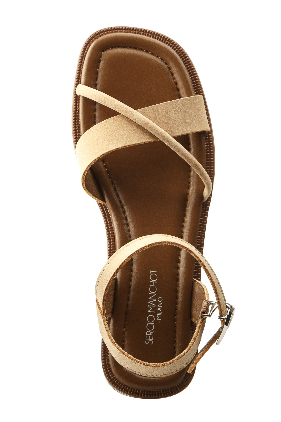 летние сандалии Sergio Manchot - отличный вариант чтобы дополнить свой образ. Это стильная и практичная модель, которая подойдет для повседневной носки. Сандалии хорошо дышат и амортизируют нагрузки, что позволяет ногам меньше уставать. Верх этой модели выполнен из натуральной кожи бeжевого цвета, внутренний подклад из экокожи.